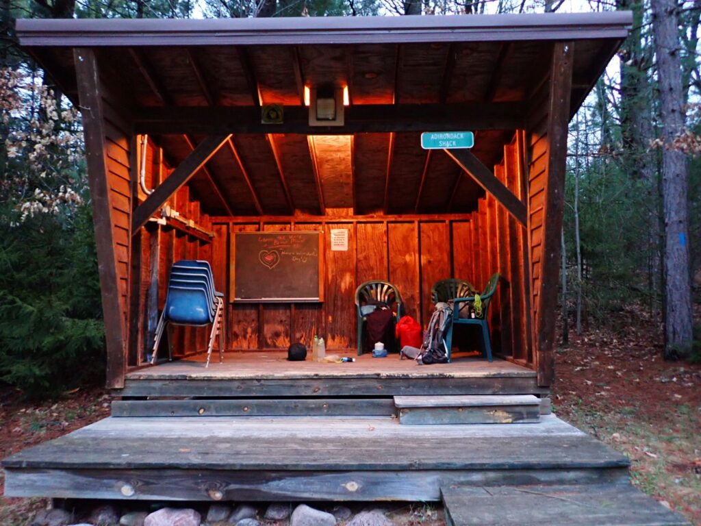 On April 25, I wanted to push ahead to a 3-sided shelter in the Iola Ski Area. But that meant hiking 30 miles, mostly on roads, and another tavern in midday. I was motivated by the chilly, steady drizzle that discouraged any rest stops until I arrived in Rosholt, where the tavern was. I arrived at the shelter late in the evening, and took advantage of the electric power and even lights! Along the Ice Age Trail, a hiker can gain an edge by using resources like a shelter. This is not a remote wilderness hike.
