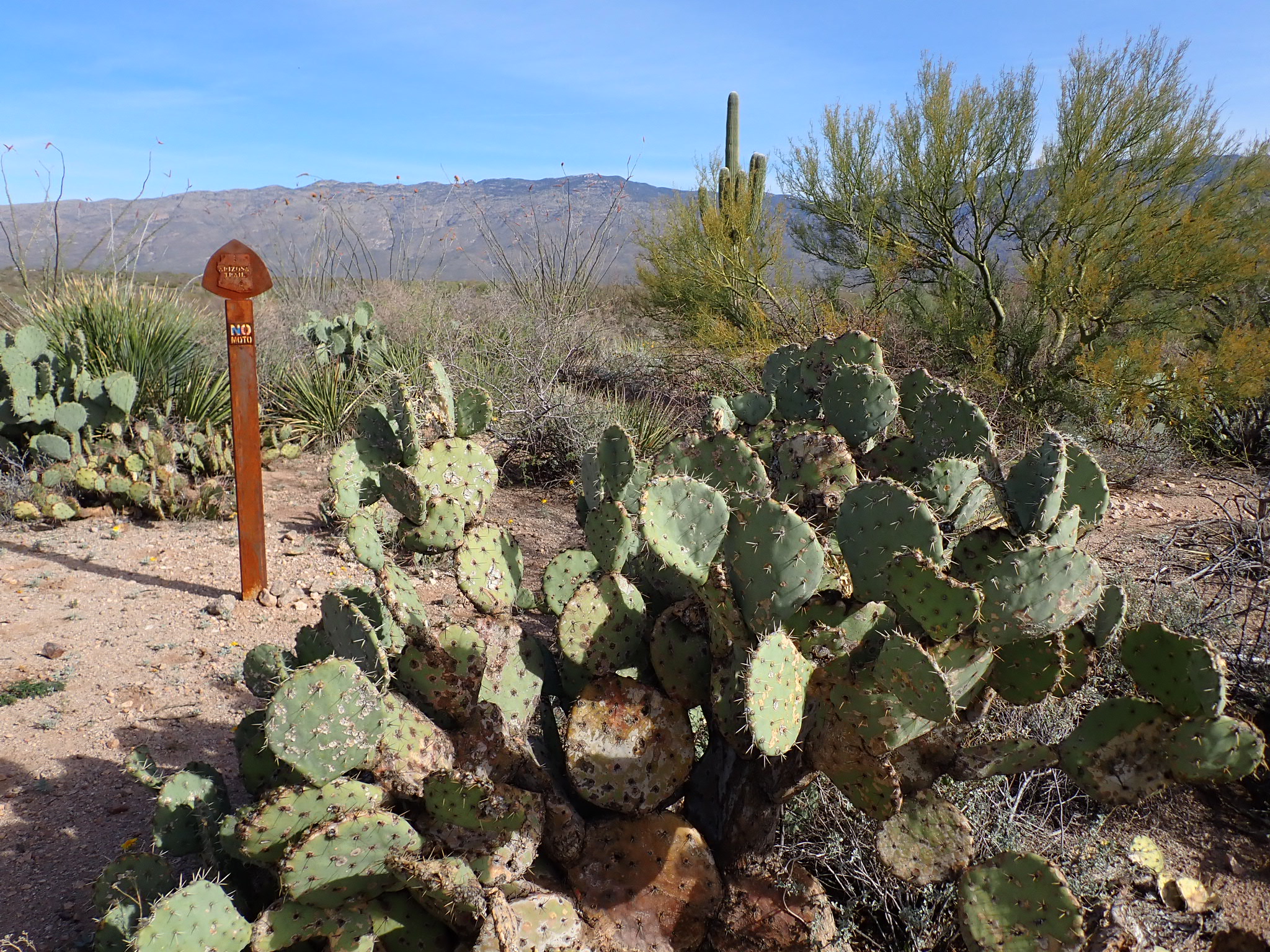 I reached mile 140 of the 800-mile AZT on March 17. There is much beauty in the desert if a hiker knows where to look. Before crossing under Interstate 10, the land where cattle had grazed was devoid of many of the trees and cacti I came here to see. When my friend / AZT hike supporter Alan and I left a campground in Colossal Cave Mountain Park to hike a couple of miles together, we enjoyed the blooms of wildflowers and cactus on an easy-going trail. I continued snapping images after Alan turned back to drive home. These are my favorite places, with no cows!