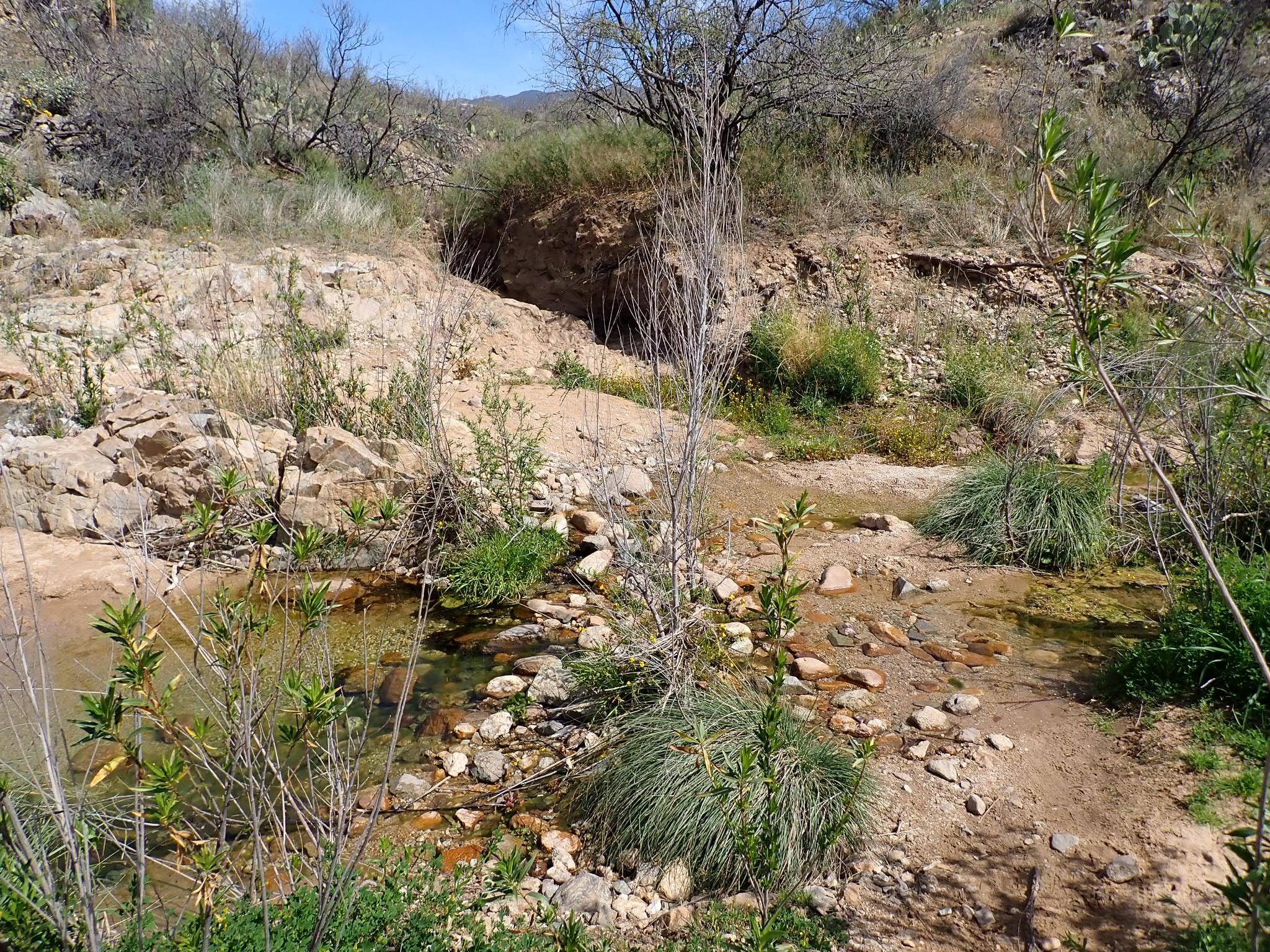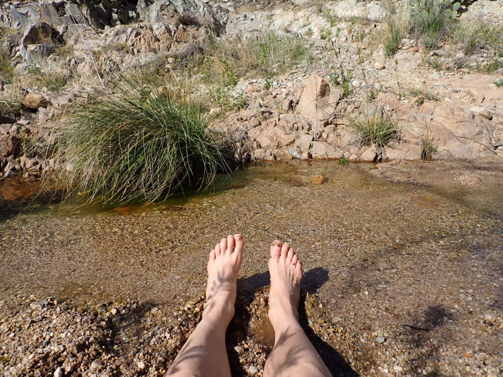 In the heat of the day, I arrived at the clear flowing Rincon Creek. The coolness of the water convinced me to stop, rest, soak my feet and, most of all, enjoy a day that excessive heat had engulfed Arizona. I chatted with about ten other AZT hikers, many of whom pushed ahead to Saguaro National Park.