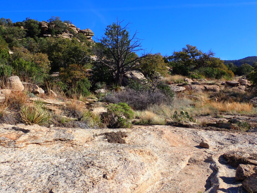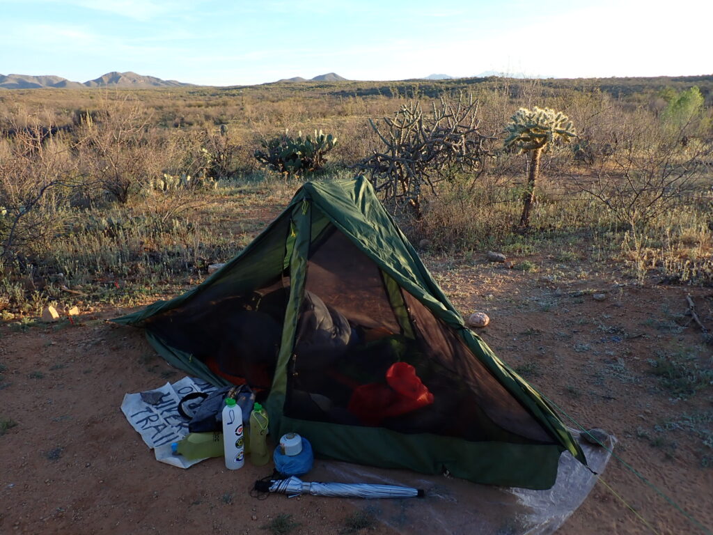 In response to the heat advisory, I cooled my feet in the gravelly edge of the creek and planned to wake hours before dawn and hike with my bright headlamp for two or three hours. Thankfully, I would reach lofty 7900 feet elevation and well above the 90-plus degrees of the desert floor. Oh, I needed to earn lower temperature by ascending 5400 feet while exposed to the sun. I used the umbrella for much of the climb while observing the saguaro cactus disappear below 5000 feet elevation and be replaced by several species of shade-giving trees, including pines. Naturally, the concern with predicted record-high temperatures kept breaking my intention to breath and step mindfully and meditatively. My brain wants to hike uphill faster than my body will allow. Water was flowing partway up and at the Manning Camp in Saguaro NP, where I spent the night watching the stars through the netting of my Six Moon Skyscape Trekker tent as the nighttime cold motivated me to zip fully into my sleeping bag.