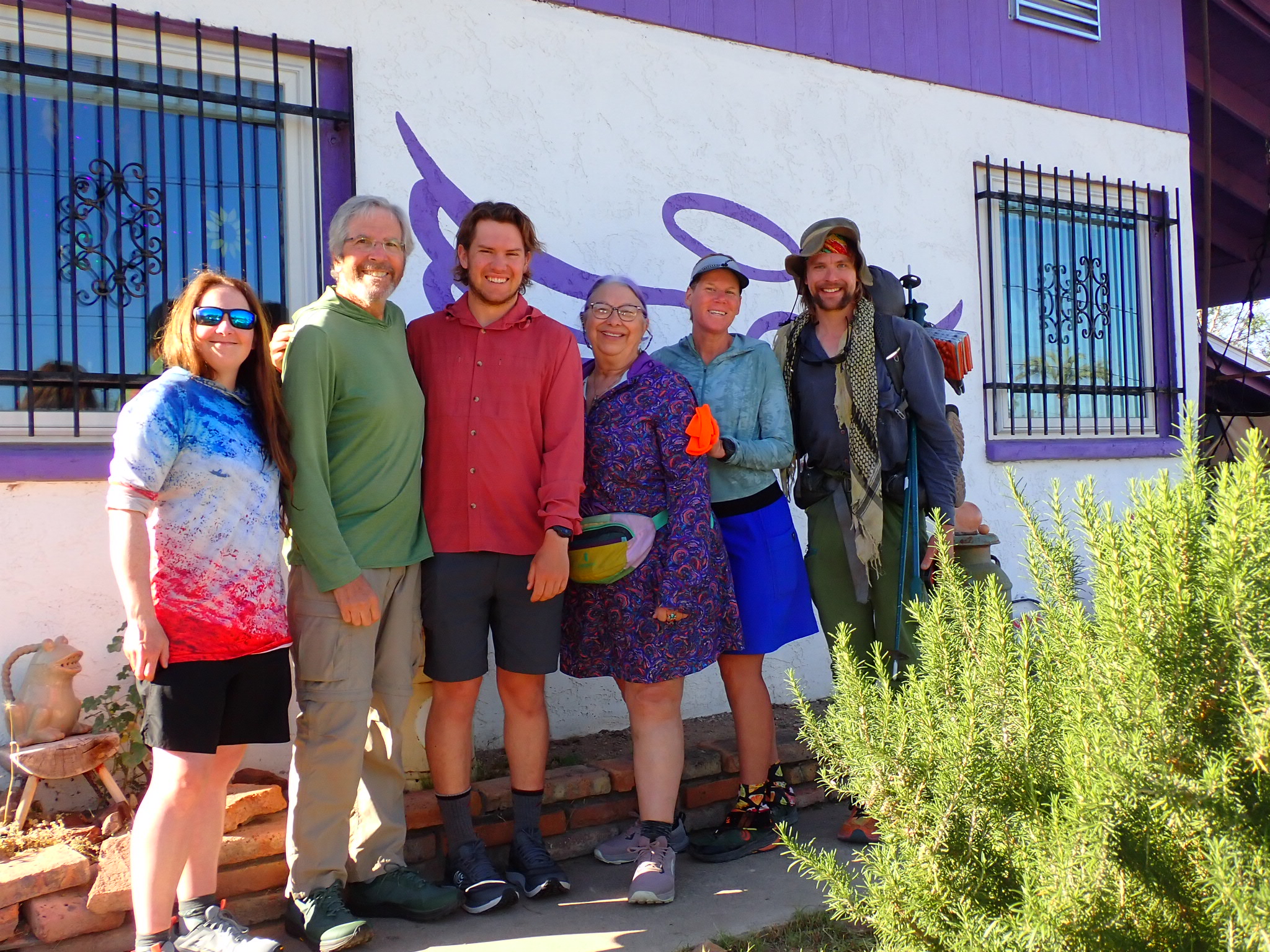 Trail Angel MJ is surrounded by happy AZT hikers