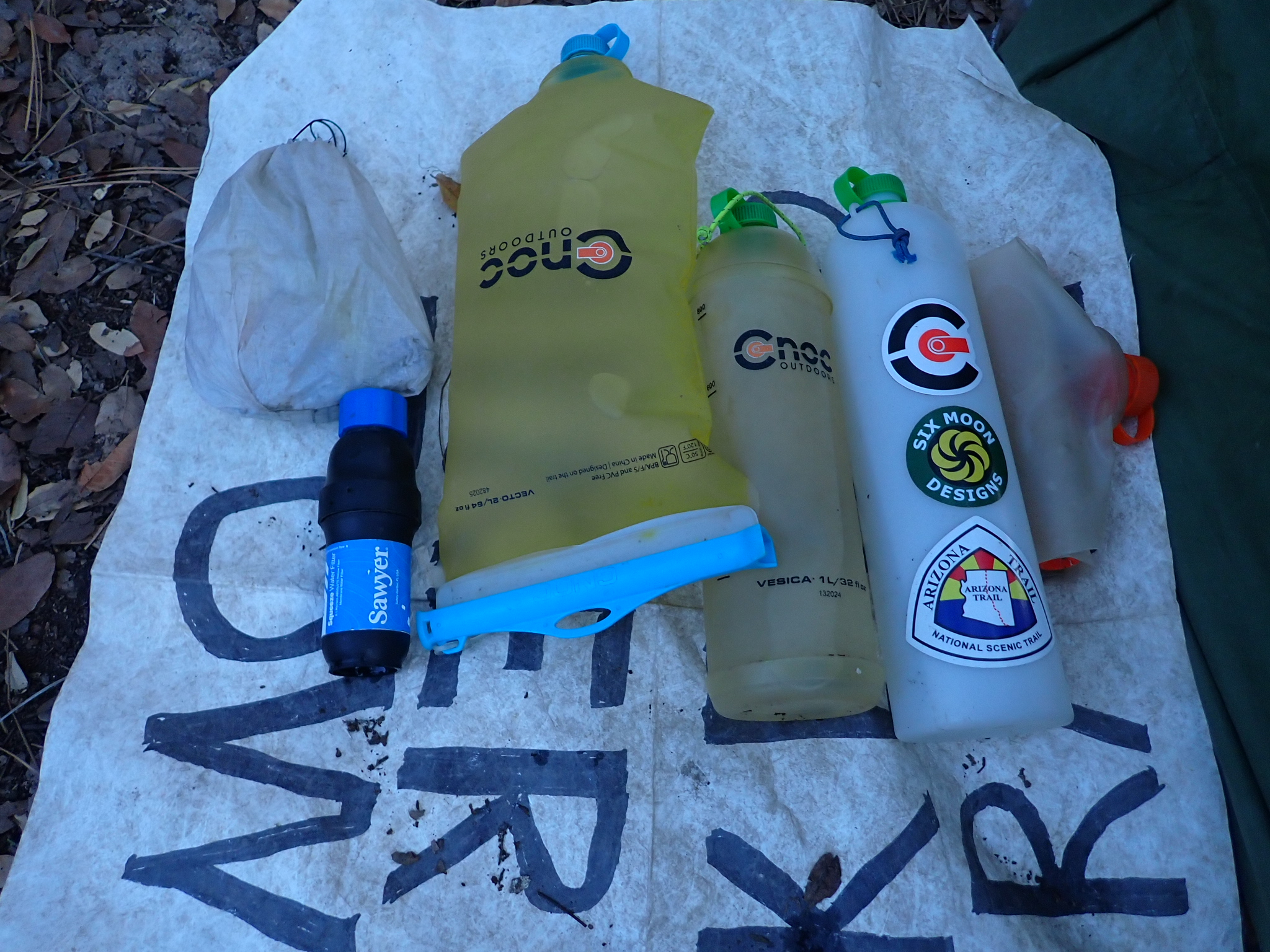 I used four CNOC bottles with a total capacity of six liters. The bottle with the orange cap held untreated water that flowed using gravity into one of the other bottles.